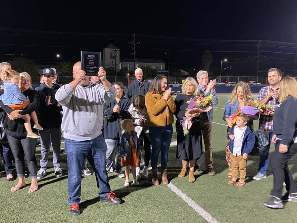 On Friday, October 22 before the 2021 Homecoming football game, the late Dustin Burke (’04) was inducted into the Village Christian Athletics Hall of Fame. Members of his family, friends, and former teammates and coaches represented the beloved leader of VCS football’s 2003 CIF-Southern Section Division XII championship team and the 2003 CIF-SS D-XII Defensive Player of the Year.
