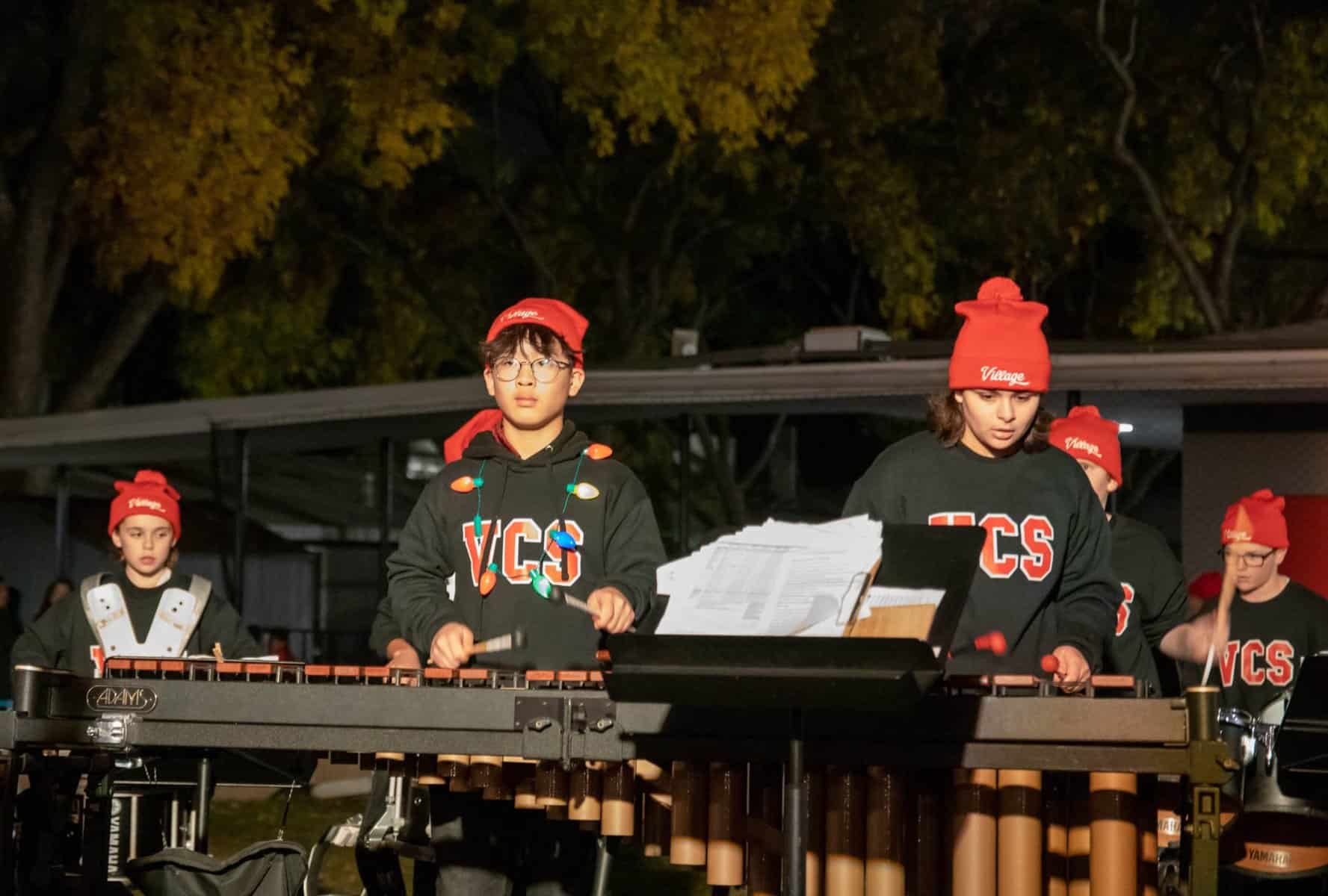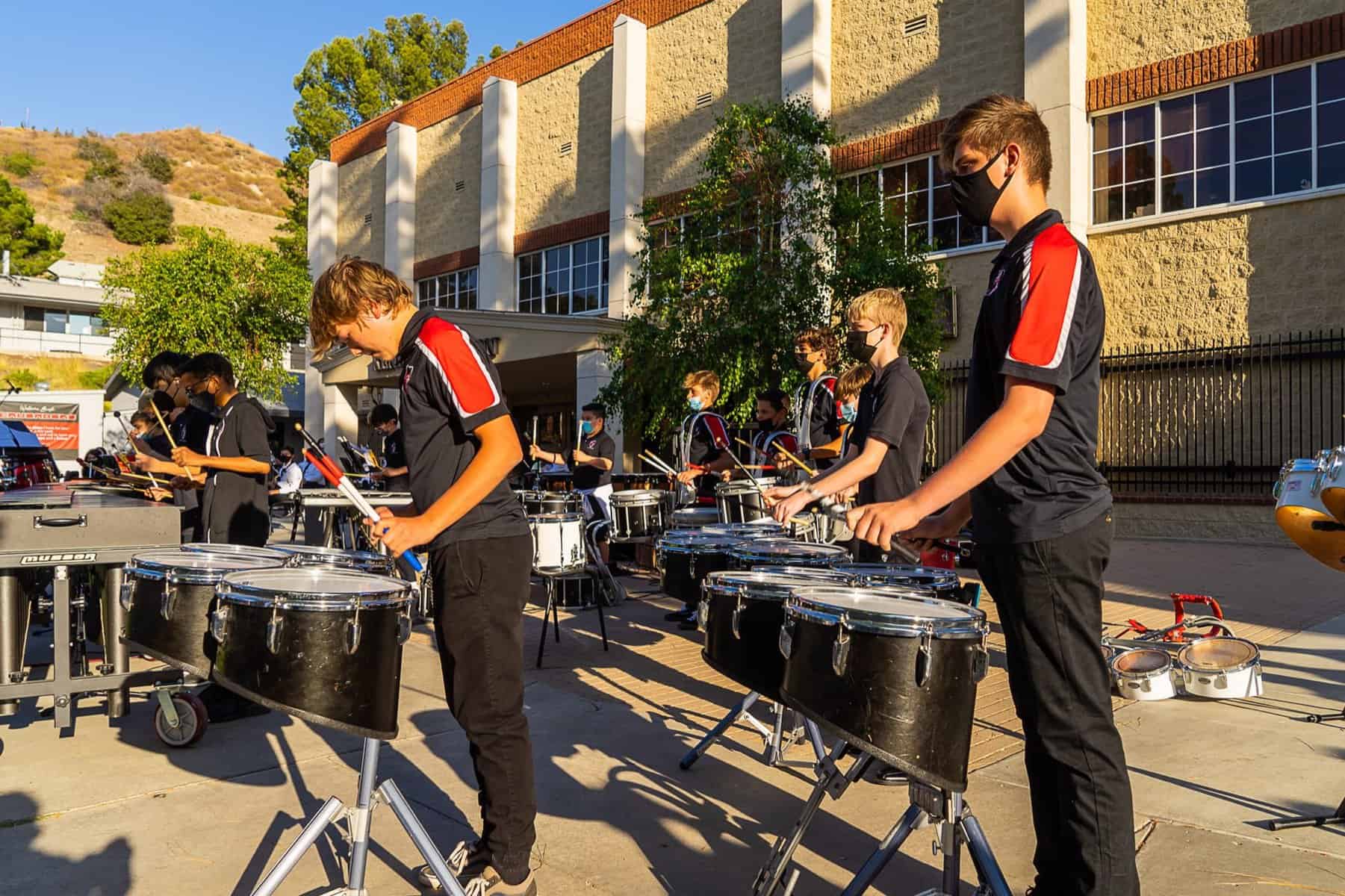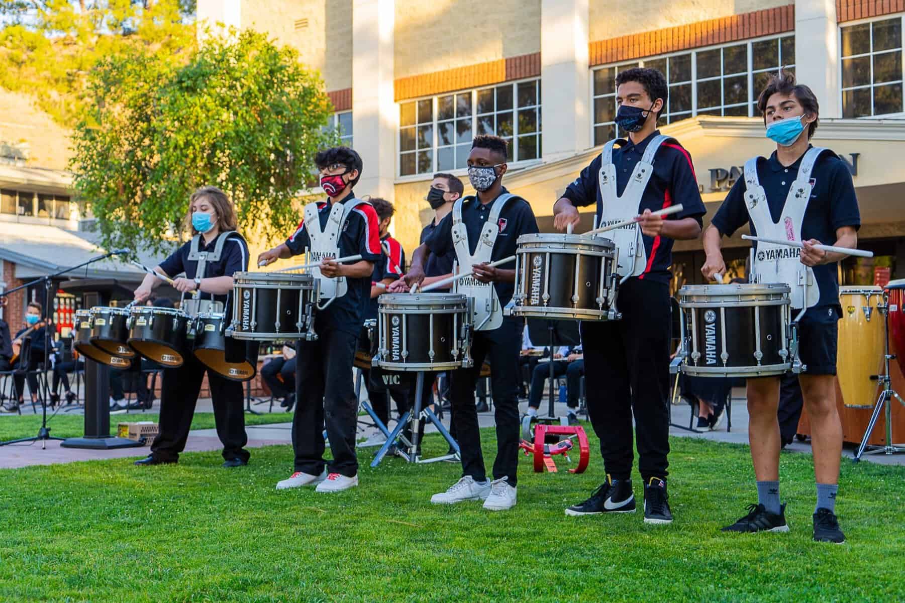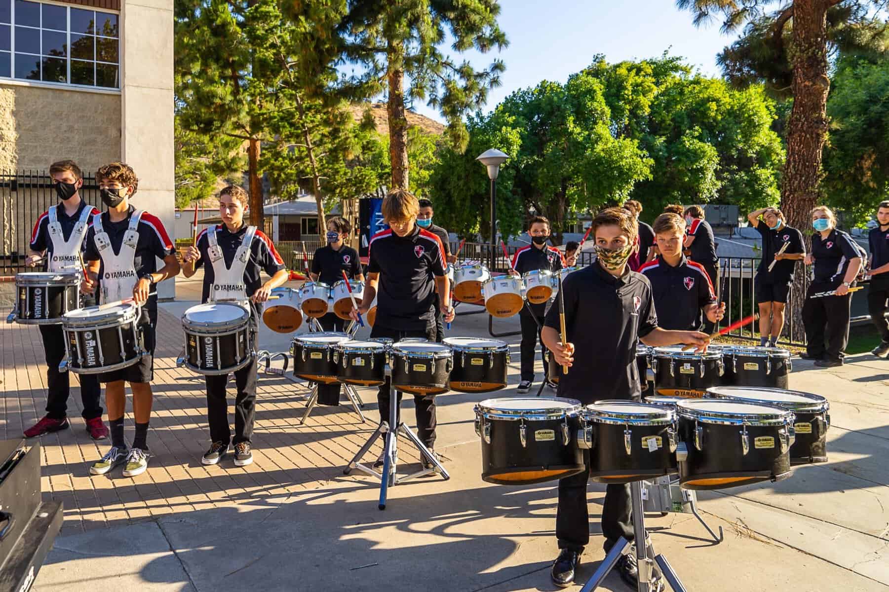 The Beginning, Intermediate & Advanced Percussion classes at Village Christian School provide a foundation in the art of drums and percussion, building on those skills to learn drum cadences and custom song arrangements for performances. Fairly unique to Village, this is a complete program dedicated to percussion rather than just a club or after-school event. In Beginning Percussion, students with no experience learn the fundamentals of percussion and rudiments, how to read sheet music, and are introduced to a wide range of instruments from marching percussion (drumline) to mallet percussion (xylophone, marimba, etc.) and beyond (timpani, cymbals, auxiliary percussion, etc.) These skills are expanded on in Intermediate Drumline and then culminates In Advanced Percussion, performing alongside the other music performance groups and as a spirit group for a host of school functions, drumming up enthusiasm wherever we go!