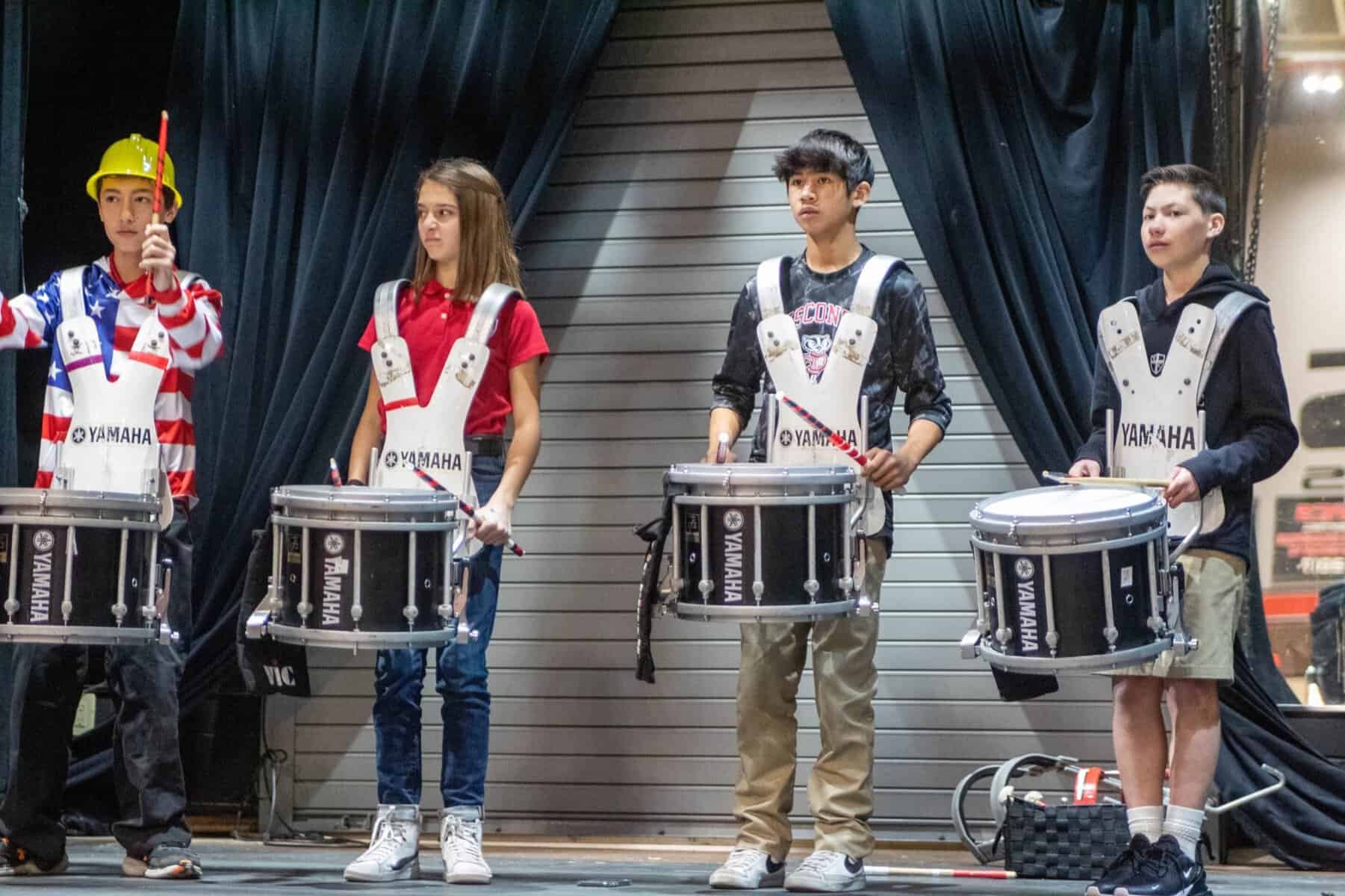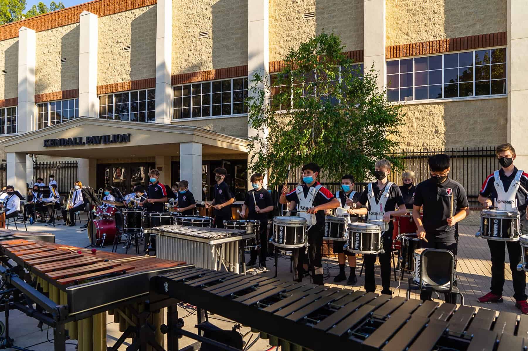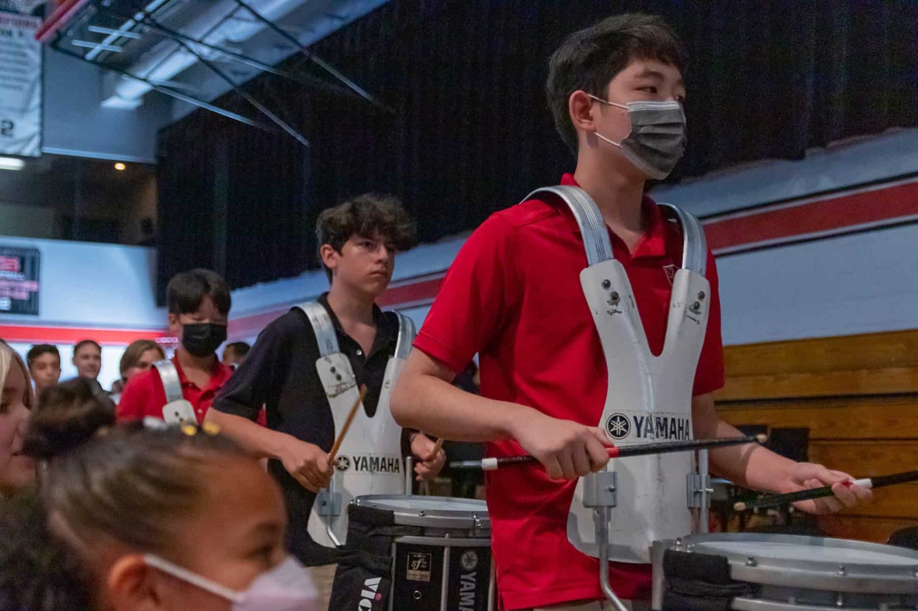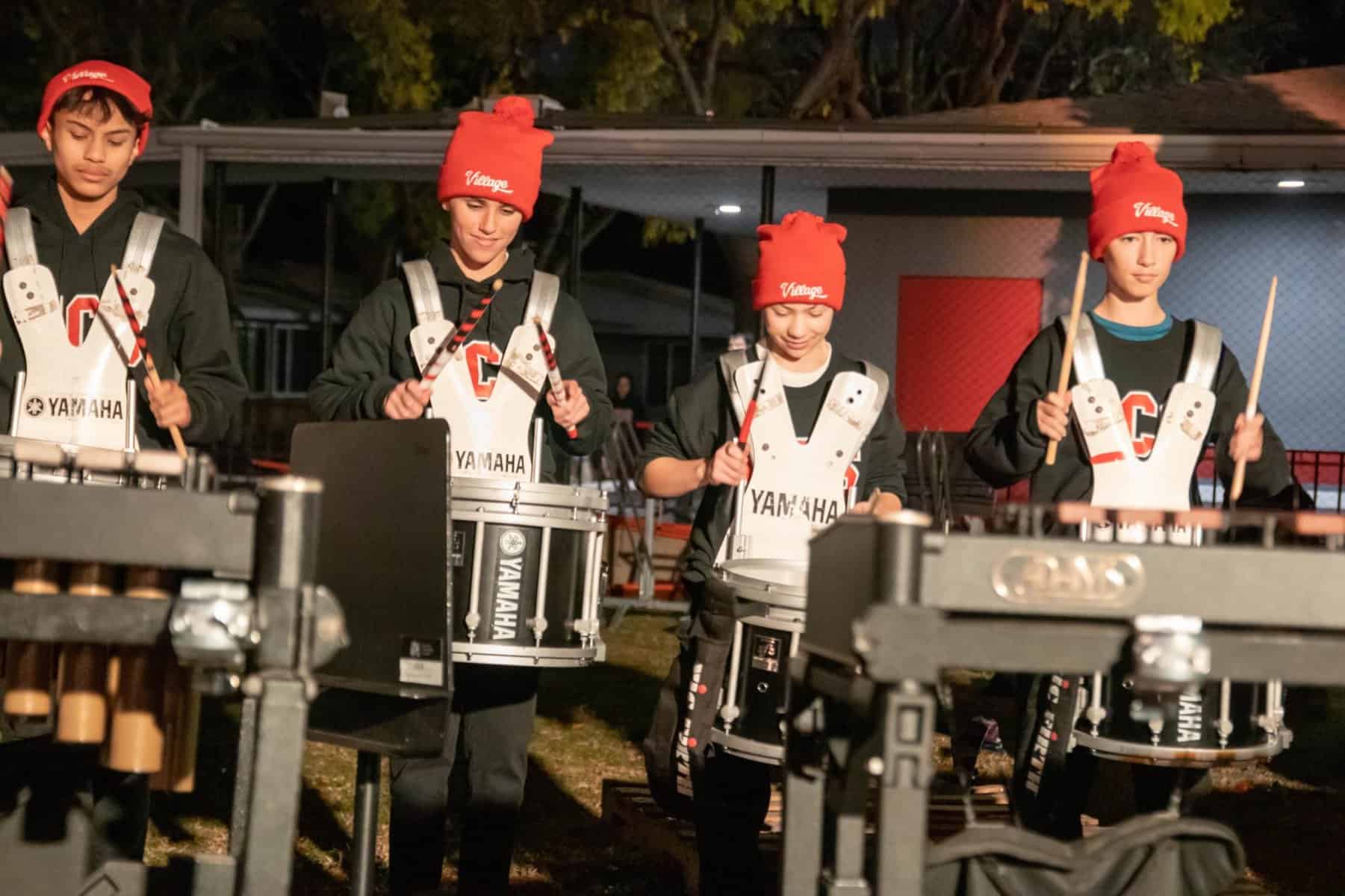 The Beginning, Intermediate & Advanced Percussion classes at Village Christian School provide a foundation in the art of drums and percussion, building on those skills to learn drum cadences and custom song arrangements for performances. Fairly unique to Village, this is a complete program dedicated to percussion rather than just a club or after-school event. In Beginning Percussion, students with no experience learn the fundamentals of percussion and rudiments, how to read sheet music, and are introduced to a wide range of instruments from marching percussion (drumline) to mallet percussion (xylophone, marimba, etc.) and beyond (timpani, cymbals, auxiliary percussion, etc.) These skills are expanded on in Intermediate Drumline and then culminates In Advanced Percussion, performing alongside the other music performance groups and as a spirit group for a host of school functions, drumming up enthusiasm wherever we go!